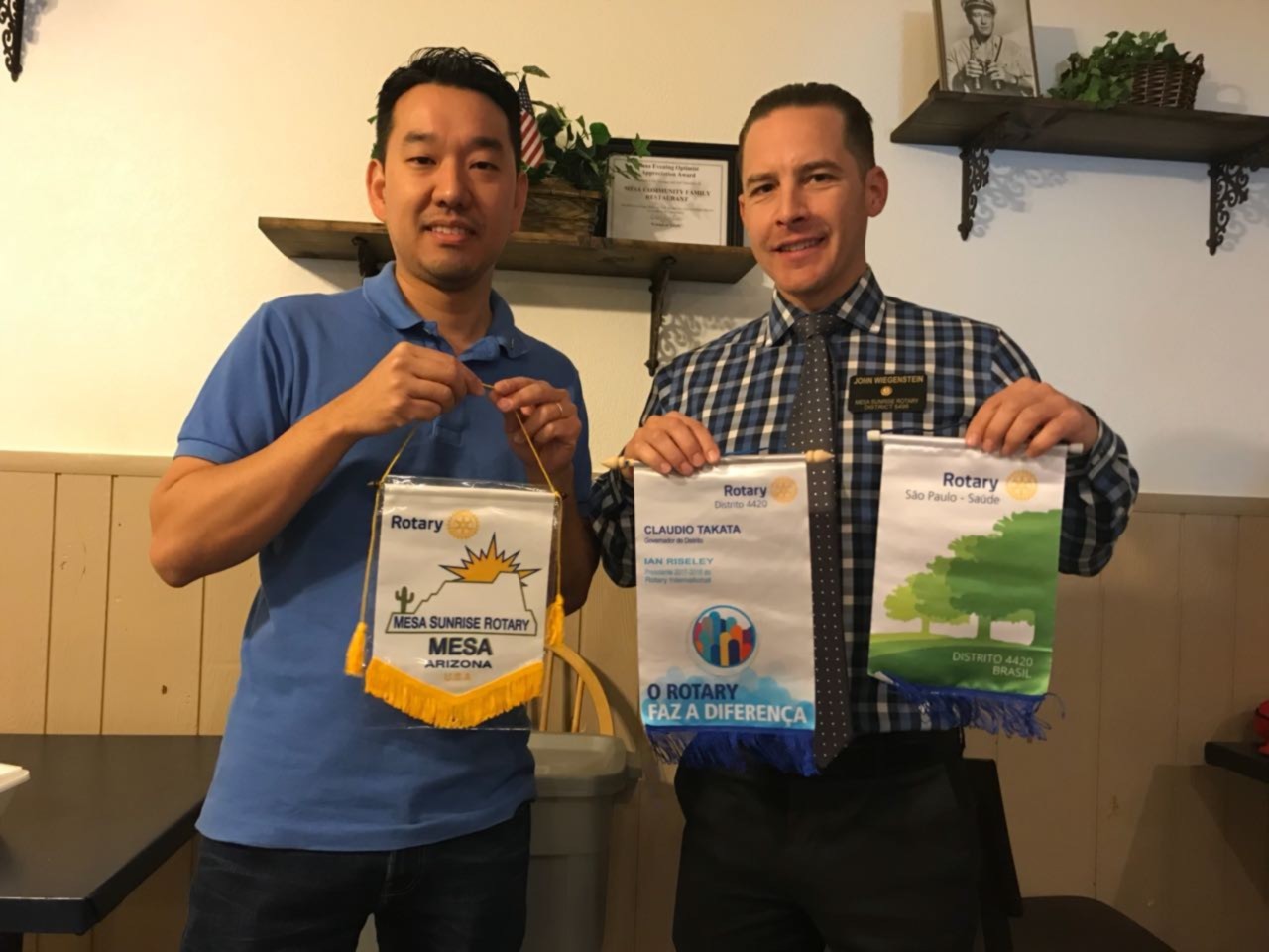 No dia 23 de maio o presidente do Rotary de São Paulo Saúde ? Ronaldo Yuzo Ogasawara, em viagem aos EUA visitou o Rotary Club Mesa Sunrise que tem como presidente John Wiegenstein. Na reunião o presidente Ronaldo falou dos projetos do Saúde e de seus clubes satélites e a atuação do clube nas principais frentes de trabalho: educação, segurança e cultura, ao final da reunião o presidente Ronaldoi recebeu um presente do companheiro rotariano comandante da polícia de Mesa Bill Peters que o condecorou com logo da polícia de Mesa/Arizona .