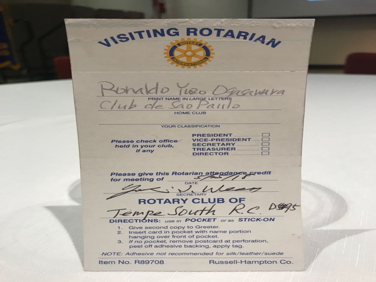 No dia 25 de maio o presidente do Rotary de São Paulo Saúde ? Ronaldo Yuzo Ogasawara, em viagem aos EUA visitou o RC Tempe South/AZ com 65 companheiros e destes 3 foram governadores do Distrito 5510. Na ocasião o presidente Ronaldo conheceu o clube satélite Camelback Crossroads com idade 30 a 45 anos na qual o propósito é viajar e ter experiências em outros países ou locais. Ronaldo falou aos presentes que a cada dia fica mais admirado da Instituição Rotary, que é uma oportunidade de experiência indescritível e que já realizoui 75 de minha programação rotária, espero finalizar nos 100.