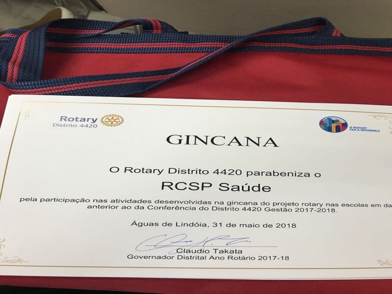 O Rotary de São Paulo Saúde recebe o Diploma pelo seu trabalho no projeto Rotary nas Escolas durante a 27ª. Conferencia do Distrito 4420.