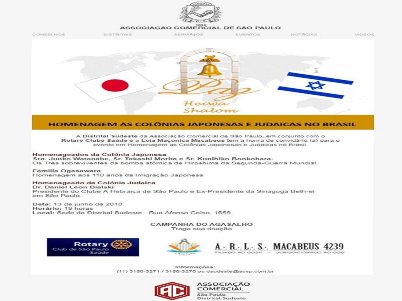 No dia 13 de junho os companheiros do Rotary de São Paulo Saúde estiveram presentes na ACSP - Distrital Sudeste prestigiando a homenagem prestada as Colonias Japonesa e Judaica no Brasil pela Distrital Sudeste
