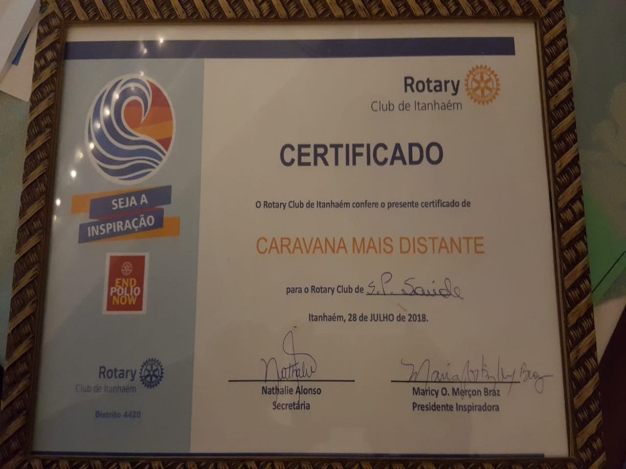 No dia 28 de julho o presidente Eric Lieb do Rotary de SP Saúde acompanhando dos companheiros do clube participaram da cerimônia de posse do Rotary Club de Itanhaém. Ao final da cerimônia o Rotary de São Paulo Saúde foi agraciado com o Diploma de Caravana Mais Distante.