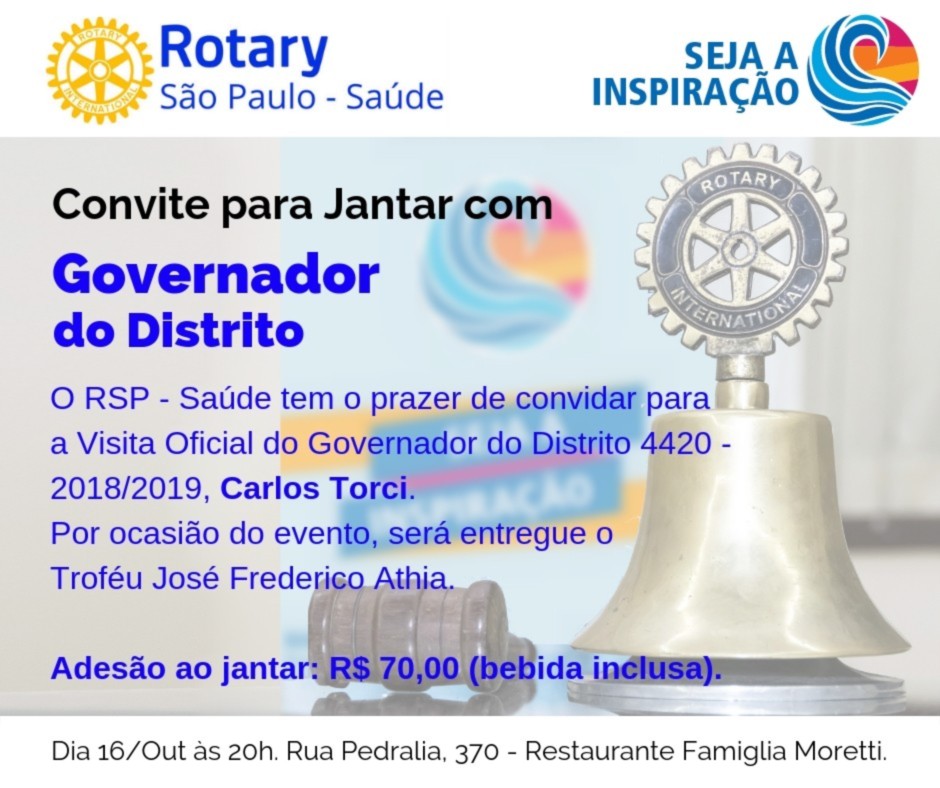 No dia 16 de outubro o Rotary de São Paulo Saúde recebeu a visita do Governador do Distrito 4420 ? gestão 2018-2019 ? Carlos Torci. Na ocasião o Clube entregou o Troféu José Frederico Athia ao Hospital Santa Cruz e deu posse a nova companheira CRISTIANE APARECIDA MARION BARBUGLIO.